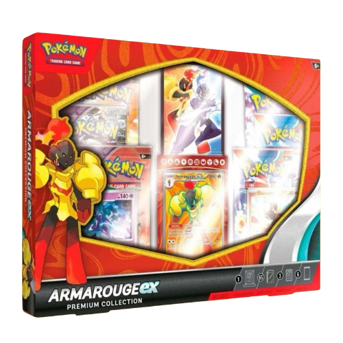 One Pokemon Armarouge ex Premium Collection. Pokemon Armarouge ex Premium Collection includes: x1 E tched Foil Promo Card Featuring Armarouge ex x2 Foil Promo Cards Featuring Charcadet and Ceruledge x6 Pokemon English Booster Packs (x2 Obsidian Flames, x2 Paradox Rift, x2 Temporal Forces) x1 Magnetic Card Protector with Display Base x65 Card Sleeves Featuring Armarouge and Ceruledge A Code Card for Pokemon TCG Live All our products ship directly from the UK. Suitable for ages 15 and up.