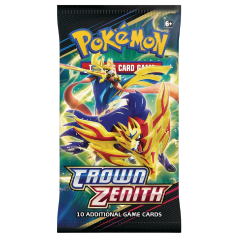 One Pokemon Crown Zenith English Booster Pack. Each Booster Pack contains 10 cards and a code card for the Pokemon TCG Online. All our products ship directly from the UK.