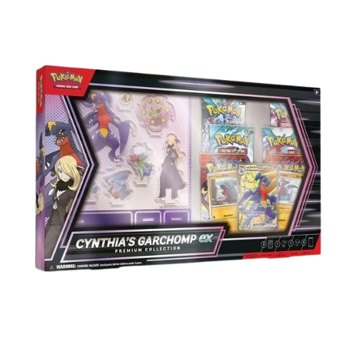 Cynthia’s Garchomp ex Premium Collection Box includes: x1 Full Art Promo Card Featuring Cynthia’s Garchomp ex x2 Foil Cards Featuring Cynthia’s Gible and Cynthia’s Gabite x1 Sheet of Acrylic Standees Featuring Cynthia, Garchomp and more x1 Double-sided Backdrop Display x1 A photo sticker of Cynthia and Garchomp x6 Pokemon TCG Booster Packs (x2 Destined Rivals, x1 Journey Together, x3 Paradox Rift) Code card for the TCG online All our products ship directly from the UK.