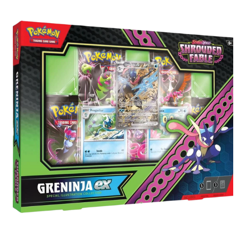 One Pokemon Shrouded Fable Greninja ex Special Illustration English Collection Box. This Box includes: x1 Full-art foil promo card featuring Greninja ex x2 Foil cards featuring either Froakie and Frogadier x5 Pokémon TCG: Scarlet & Violet Shrouded Fable Booster Packs A code card for Pokémon TCG Live All our products ship directly from the UK. Suitable for ages 15 and up.
